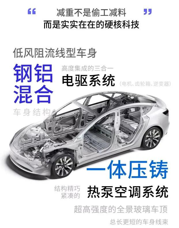 車身輕量化,用鋁合金、碳纖維替代傳統(tǒng)鋼材,蔚來的全鋁車身就比鋼車身輕了30%,特斯拉Model 3的碳纖維車頂則直接減重超20公斤,部分高端車型還采用鋁鎂合金混合車身,進(jìn)一步降低簧下質(zhì)量;