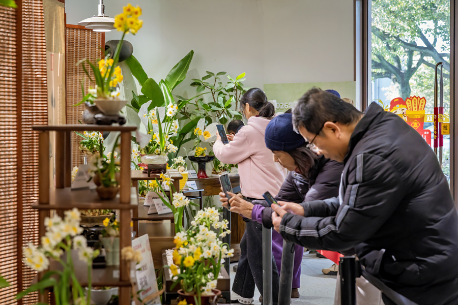 今年春節(jié)恰逢梅花的最佳觀賞期。世博文化公園的“奇花藝境”展上,200多棵姿態(tài)各異的垂枝梅吸引了不少遠道而來的游客。
