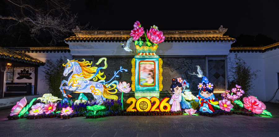 古猗園南門的自貢彩燈景觀,這是一輛中式馬車,拉車的是一匹白色的駿馬,而車廂是一只方瓶。透過車窗,可以看到四幅花神的卡通畫,寓意人生四時。 陳林寶攝